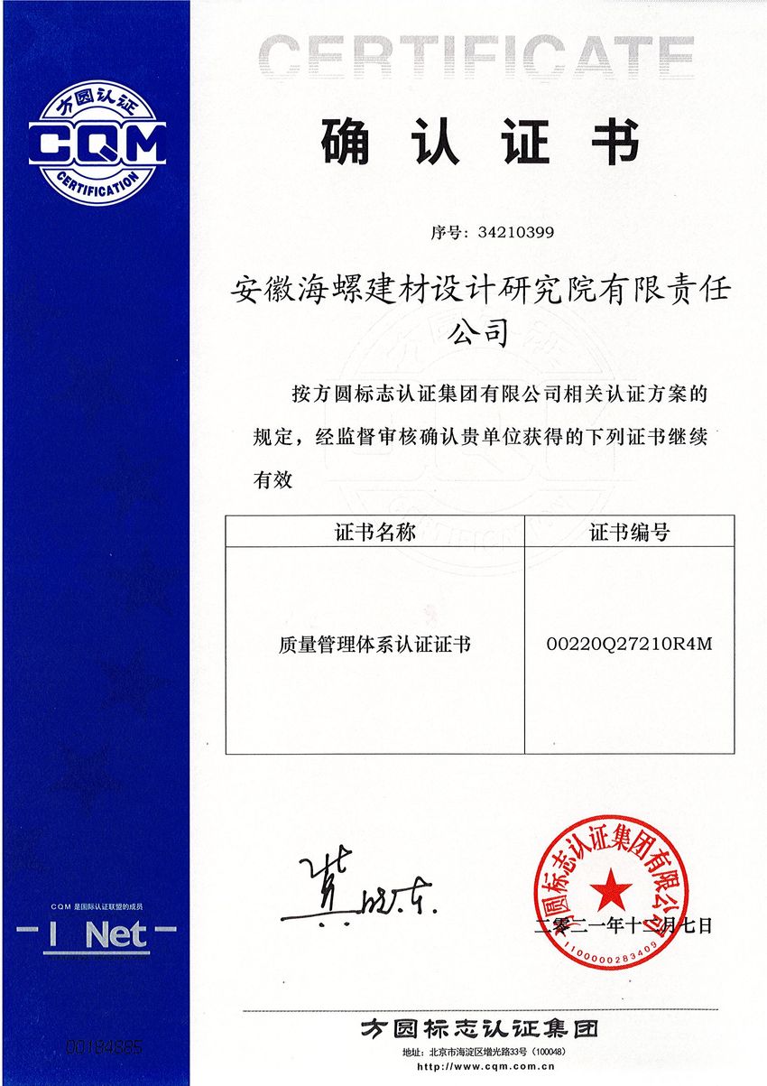 12月8日,海螺設(shè)計(jì)院正式收到方圓標(biāo)志認(rèn)證集團(tuán)有限公司頒發(fā)的質(zhì)量、環(huán)境、職業(yè)健康安全管理體系認(rèn)證證書,標(biāo)志著海螺設(shè)計(jì)院在管理創(chuàng)新過程中又取得一項(xiàng)新的成果。